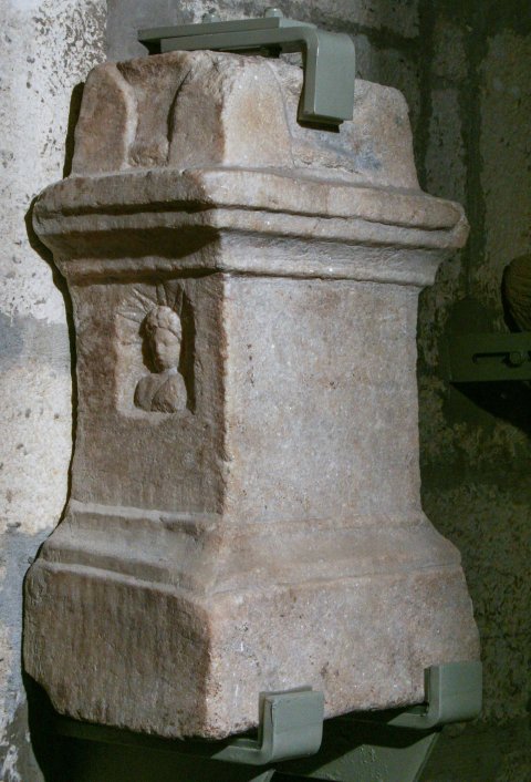 - auf den Nebenseiten je eine kleine Bogennische mit Büste des Sol mit Strahlenkrone