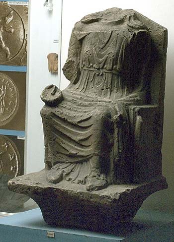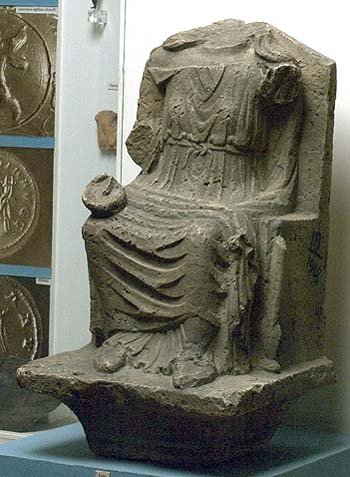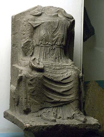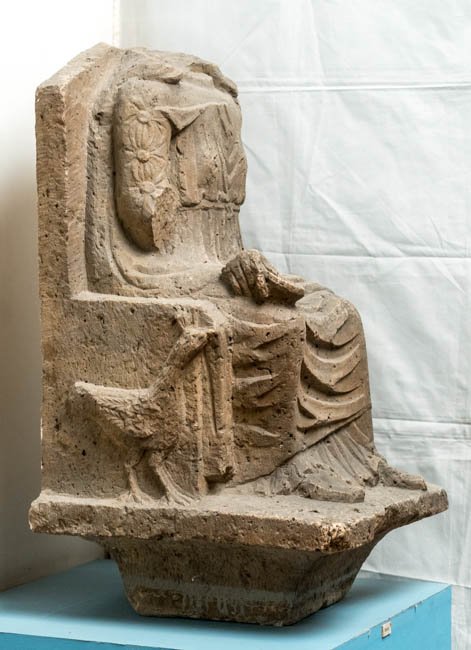 - Mythische Figur: Auf rechteckigem, sich nach unten zu verengenden Sockel thronende Juno in gegürtetem Chiton mit geknöpftem Scheinärmel, Mantel und Schuhen, der linke Arm war erhoben und auf Szepter gestützt, die rechte Hand hält eine Schale (patera)l. Auf der Thronlehne Pfau.