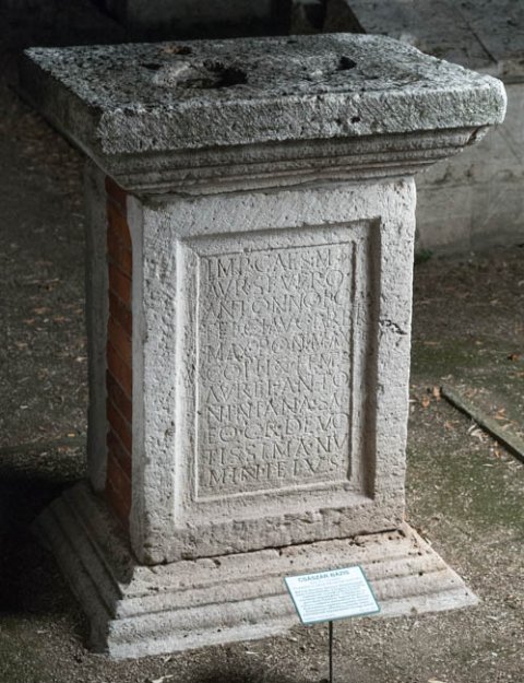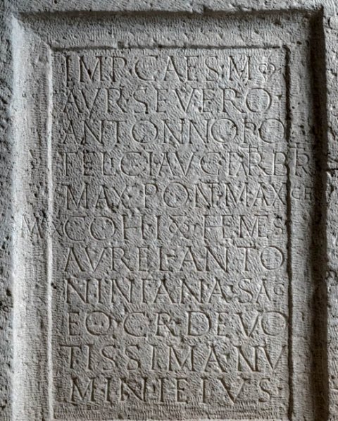 - Imp(eratori) Caes(ari) M(arco) / Aur(elio) Severo / Antonino pio / felici aug(usto) Part(h)i(co) Brit(annico ) / max(imo) pont(ifici) max(imo) Ger(manico) / max(imo) coh(ors) I (milliaria) Hemes(enorum) / Aurel(ia) Anto/niniana sag(ittariorum) / eq(uitata) c(ivium) R(omanorum) devo/tissima nu/mini eius