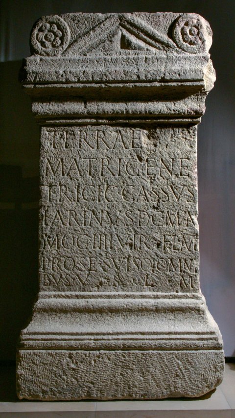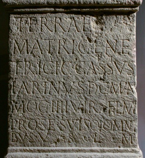 - Terrae / Matri Gene/trici C(aius) Cassius / Karinus dec(urio) mun(icipii) / Mog(entianae) IIII vir fl(a)m(en) / pro se suisq(ue) omni/bus v(otum) s(olvit) l(ibens) m(erito)