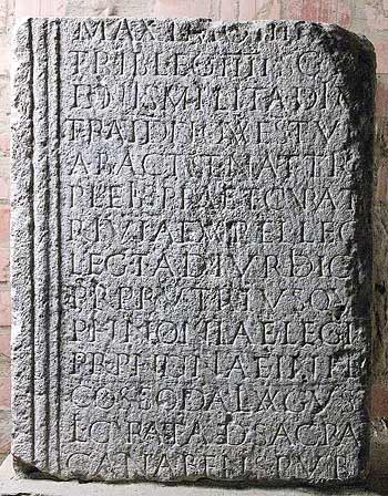- [ C(aio) Claudio ---] / Maximo IIII [ v(iro) v(iarum) c(urandarum) ] / trib(uno) leg(ionis) IIII Scy[th(icae) ] / donis milit(aribus) a divo / Trai(ano) don(ato) quaest(ori) ur[b(ano) ] / ab act(is) senat(us) tr[ib(uno) ] / plebis praet(ori) curat[o]/ri viae Aurel(iae) leg(ato) / leg(ionis) I ad(iutricis) iuridic[o ] / pr(o) pr(aetore) utriusqu[e ] / Pannoniae leg(ato) pr(o) / pr(aetore) Pannoniae Infer(ioris) / co(n)s(uli) sodali Augusta/li curat(ori) aed(ium) sacra[r(um) ] / canabens(es) pub(lice) --- (?)