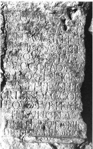 - Pro salute d(omini) n(ostri) / Imp(eratoris) Mar(ci) Aurel(i) / Antonini Pii / Felicis Aug(usti) Mar(cus) / Ulp(ius) Quintianus / dec(urio) col(oniae) Aq(uincensium) II vir/alis q(uin)q(uennalis) designa/tus et Titus Fl(avius) A[p]/rilis dec(urio) col(oniae) s(upra)[s(criptae)] equo pub(lico) praepo/siti annon(a)e v(otum) s(olverunt) / l(ibentes) m(erito) Imp(eratore) Antonino / IIII et Balbino II co(n)s(ulibus)