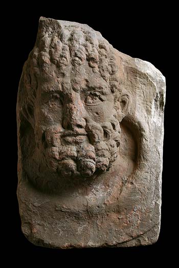 - Mythische Figur (Herakles-Hercules) : Büste mit Schulteransatz, die aus dem vertieften Mittelteil eines runden Schildes (Clipeus) mit vorgewölbtem Rand ragt. Der Oberkopf überragt den Schildrand. Kopf mit kurzen Locken und gelocktem Vollbart, Falten über der Nasenwurzel.