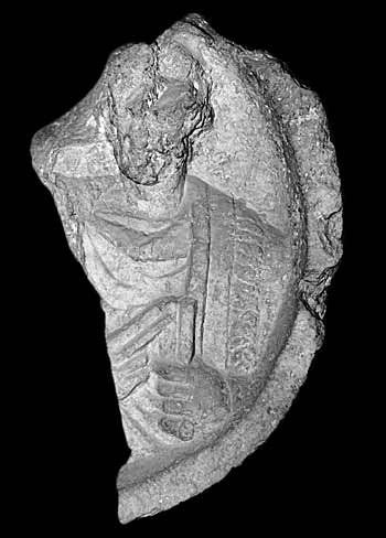 - In glattem Rahmen zwei Brustbilder (Ehepaar ?). Rechts Mann: bärtig, Sagum mit Fransen, Fibel, in der Linken Rolle (volumen), Fingerring. Linke Person weggebrochen.