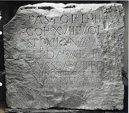 - [- Urvini]o / Pastori militi / co(ho)r(tis) XVIII vol(untariorium) / stip(endiorum) XII an(orum) XXXV et P(apiae) / Elpidi an(norum) XXXX et Urv(iniae) / Muss(a)e an(norum) XXVIII et P(ublio) / Urvinio et P(ublio) Marcellino / [an(norum)] XXII Papia Matercia mater et P(ublius) / Urvi(nius) Messius et Iul(ius) Maior frat(res)
