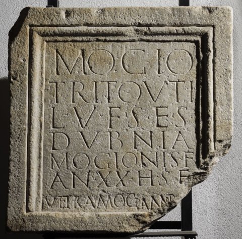 - Mogio / Tritouti / l(ibertus) v(ivus) f(ecit) s(ibi) e(t) s(uis) / Dubnia / Mogionis f(ilia) / an(norum) XX h(ic) s(ita) e(st) / Vetra Mogi(onis?) annor[um