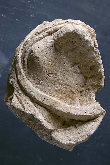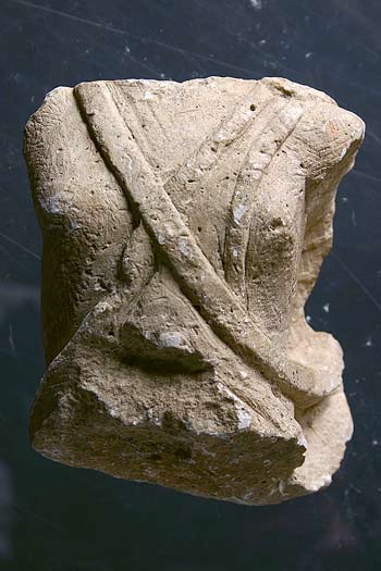 - Mythische Figur (Diana) : Weiblicher Oberkörper, auf der linken Schulter Chiton mit Scheibenfibel, rechte Brust entblößt. Von rechter Schulter zur linken Hüfte Köcherriemen. Rechter Arm war erhoben, auf dem Rücken Reste eines wehenden Mantels.