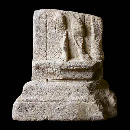 - vierkantiger Pfeiler mit profiliertem Sockel, auf der Vorderseite darüber vorspringende Basisplatte für eine stehende unbekleidete (?) Figur, die sich vielleicht an die Halbsäule neben ihrer linker Seite lehnte. Neben- und Rückseite gerahmt.