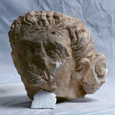- Porträt eines bartlosen Mannes mit gewelltem, in die Stirn gekämmtem Haar. Am Hinterkopf kleiner Rest des Reliefgrundes.