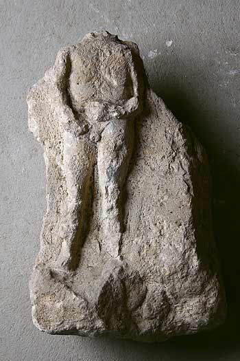 - auf vorspringender Standleiste frontal stehender nackter Mann, der mit beiden Händen etwas vor dem Leib hielt