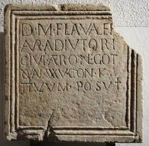 - D(is) M(anibus) Fla(via) Valer[ia] / Aur(elio) Adiutori / civi Afro negot(iatori) / o(bito) an(norum) XXXV con(iugi) k(arissimo) / titulum posuit