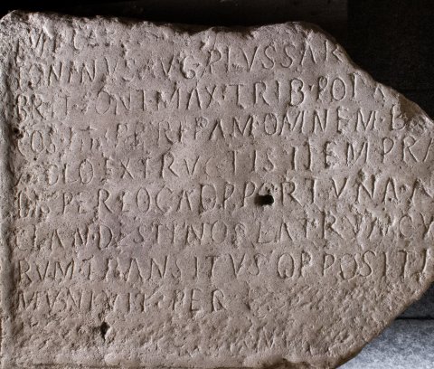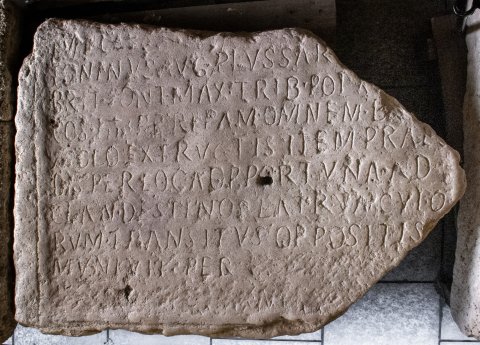 - Imp(erator) Caes(ar) M(arcus) [Aur(elius) Commodus An]/toninus Aug(ustus) pius Sar[m(aticus) Ger(manicus)] / Brit(annicus) pont(ifex) max(imus) trib(unicia) pot(estate) V[I imp(erator) IIII] / co(n)s(ul) IIII p(ater) p(atriae) ripam omnem b[urgis] / a solo extructis item praes[i]/dis per loca opportuna ad / clandestino latrunculo/rum transitus oppositis / munivit per L(ucium) C[ornelium] / F[elicem Pl]ot[an]u[m leg(atum) pr(o) pr(aetore)