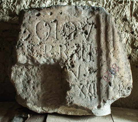 - rundum abgebr., rechts Rahmenrest, stark verwittert