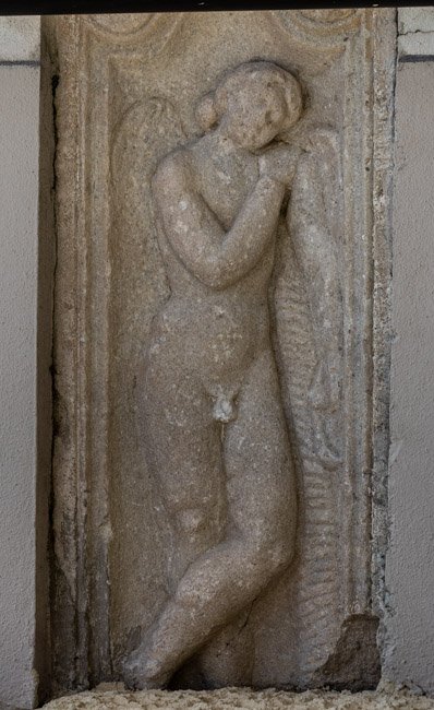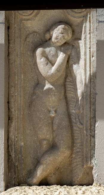 - Nackter geflügelter Trauergenius, die linke Achsel auf Fackel gestützt, in der gesenkten Linken Kranz, rechte Hand auf der linken Schulter, Beine gekreuzt. Profilierter Rahmen, oben Bogen mit Volutenenden.