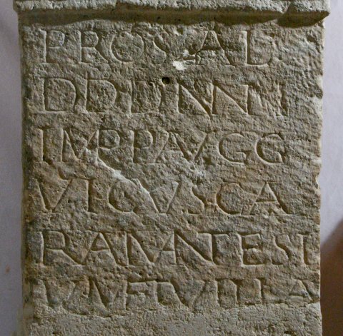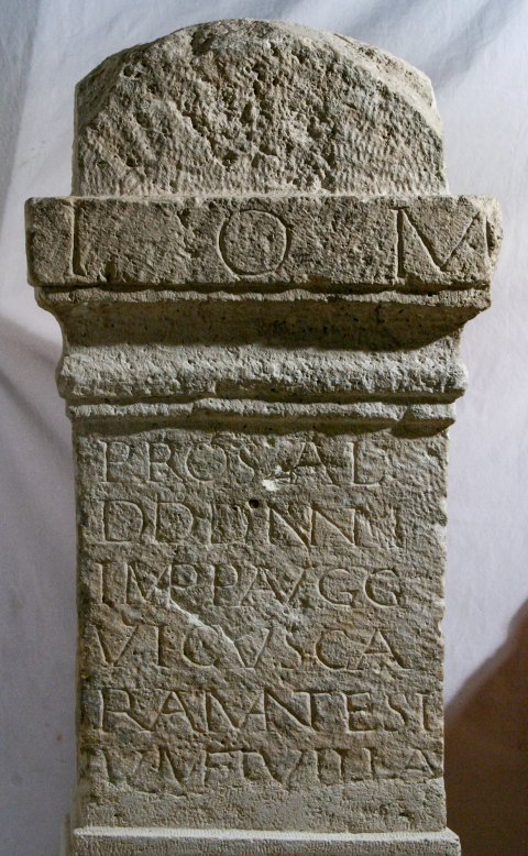 - I(ovi) O(ptimo) M(aximo) // pro sal(ute) / ddd(ominorum) nnn(ostrorum) / Impp(eratorum) Augg(ustorum) / vicus Ca/ramantesi/um et villa / [---?