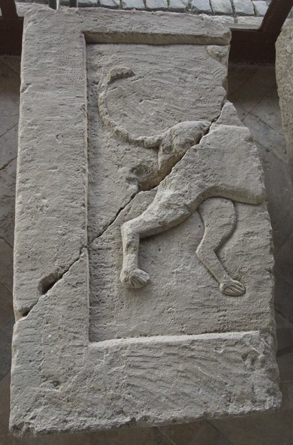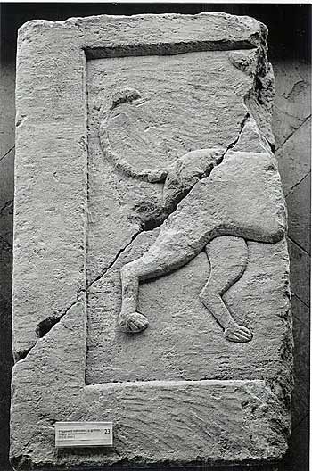 - Mythische Figur : nach rechts schreitender geflügelter Greif in einfach gerahmtem Bildfeld.