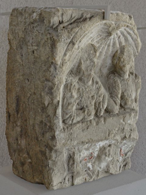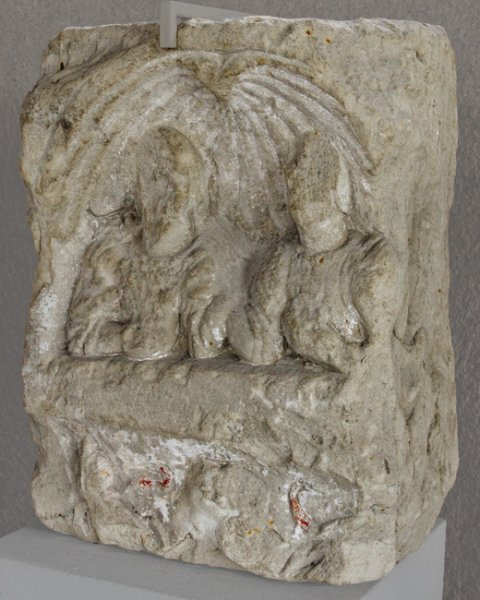 - nur Oberteil erhalten; stellenweise verwittert; Farbreste (weiß, dunkelocker, rot)