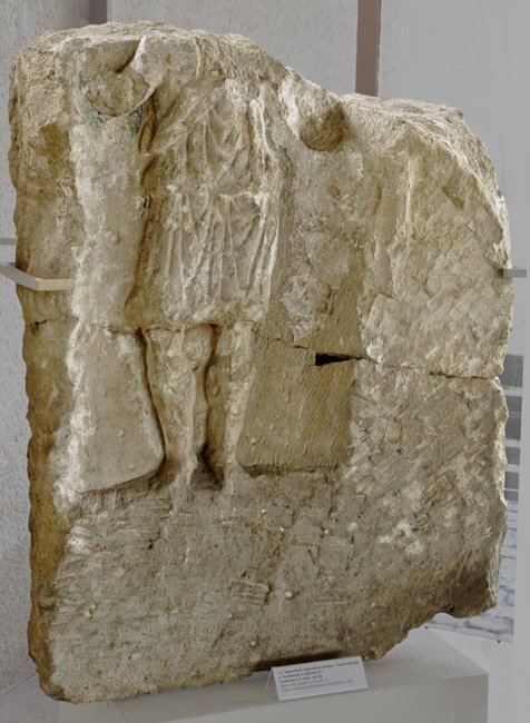 Eckblock: auf der Vorderseite Mann (Opferdiener ?): in Rechtecknische stehende Figur (en face) in kurzer Tunika mit entblößter rechter Schulter. Unten und rechts Randleiste.
