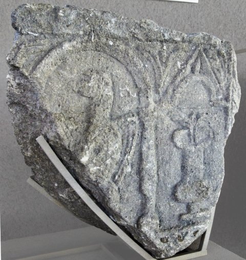 - In der Mitte Bogen auf Säulen, dazwischen stehender Adler, seitlich des Bogens Blattkelche. Rechts von der Arkade Giebel mit eingeschriebenem Bogen, in der Giebelspitze Pinienzapfen. Im Rechteckfeld unter dem Giebel schlankes Gefäß (Lutrophoros ?), aus der Mündung wachsende Pflanze (?). Oberteil einer Grabstele ?