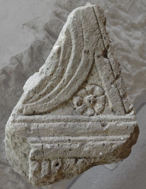 - Rest eines dreieckig gerahmten Feldes mit Draperie (velum ?), im Eckzwickel Rosette. Unterhalb (?) Ansatz eines Pilasters ?