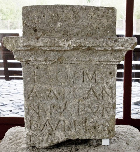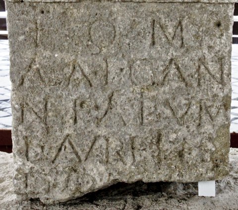 - I(ovi) O(ptimo) M(aximo) / ala I Can/ninafatium / L(ucius) Aurelius / Dion(ysius) / [[praef(ectus) (?), sta(tor) praef(ecti) al(ae) (?)] / [v(otum) s/(lvit) l(ibens) l(aeta) m(erito)]