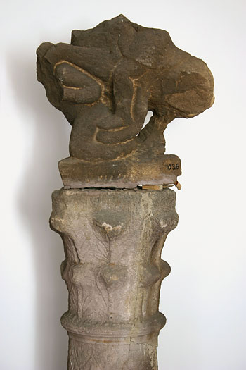- Mythische Figur : Über einen Giganten hinwegreitender Jupiter. Säule mit geschupptem Schaft und Blattkapitell.