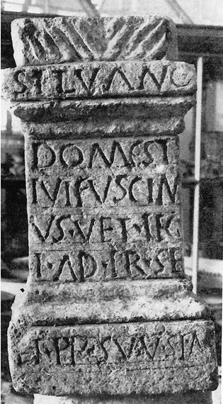 - Silvano // Domest(ico) / Iul(ius) Fuscin/us vet(eranus) leg(ionis) / I ad(utricis) pr(o) se // et pr(o) su(is) v(otum) s(olvit) l(ibens) m(erito)