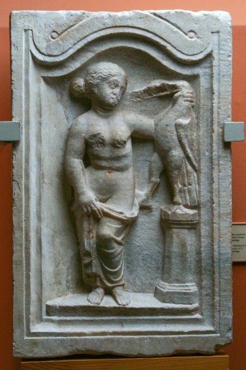 Mythos: in den Feldern seitlich des Schriftfeldes links Ganymed mit Hirtenstab, Mantel und Stiefeln, vom Adler entführt. Rechts Leda neben einem Altar, auf dem der Schwan steht. Ihre Linke umfaßt den Hals des Vogels.