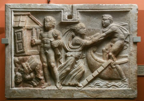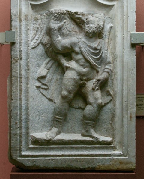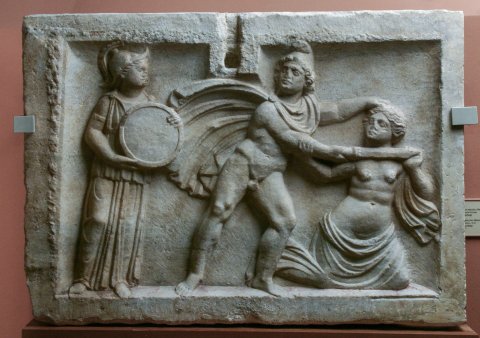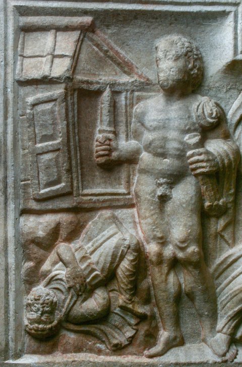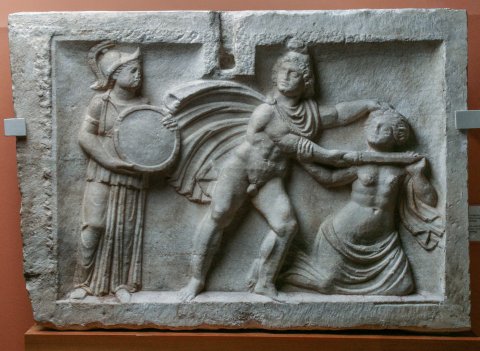 Auf der rechten Schmalseite in der Mitte Perseus mit phrygischer Mütze und wehendem Mantel. Seine Linke packt das Haar der knienden Medusa, in der Rechten Schwert. Links Athena (Minerva) mit Peplos und Helm, hält einen Rundschild vor sich.