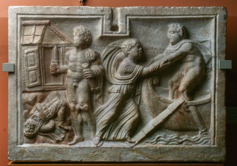 Auf der linken Schmalseite Flucht Iphigenies: rechts Schiff, darauf Orest, der Iphigenie mit beiden Händen den Landungsstegg hinaufzieht. Links der Artemistempel von Tauris mit geöffnetem Tor, davor die Leiche des Thoas in orientalischer Tracht. Vorn Pylades mit Schwert in der Rechten, Schwertscheide in der Linken.