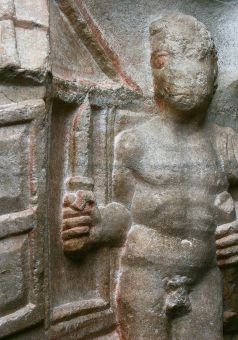 - nur die 2 Seitenfelder der Inschriftseite u. beide Schmalseiten des Sarkophagkastens erh. Reste roter Farbe