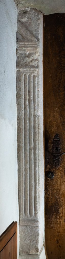 - Rechte Ecke eines eingeschriebenen Giebels, darunter kannelierter Pilaster mit Blattkapitell. Rahmen einer Grabstele ?