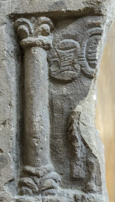 - In Rechtecknische Halbsäule mit Blattkapitell und ähnlich geformter Basis, rechts davon zwei kreisförmige Objekte (Gefäß mit aufgeklapptem Deckel ?), darunter Reliefrest (stehende Person ? Pferdeschwanz- und Hinterbein ?).