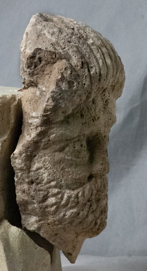 - Kopf eines bärtigen Mannes mit glatt gesträhntem Haar. Teil eines Grabreliefs.
