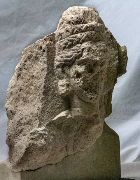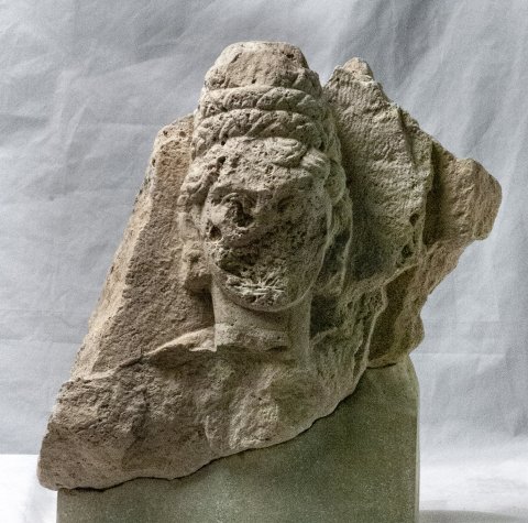 - Kopf und Schulterpartie einer Frau, Frisur aus drei zu einer Krone auf dem Oberkopf aufgesteckten Zöpfen. Teil eines Grabreliefs.