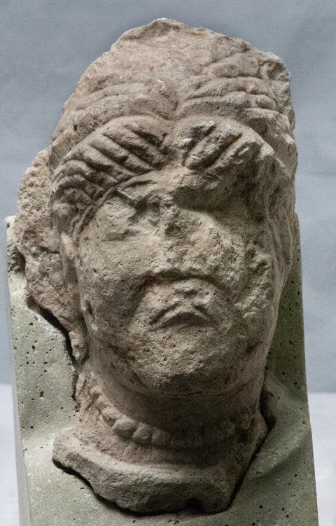 - Fragment eines Frauenporträts von einer Stele ? In der Mitte gescheitelte, aufgetürmte Frisur, Perlenkette. Teil eines Grabreliefs.