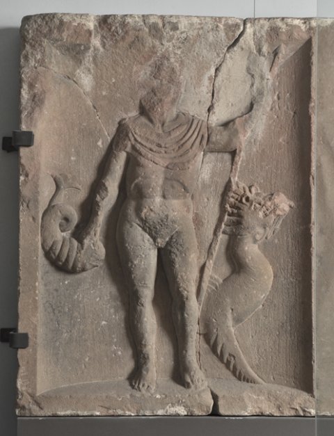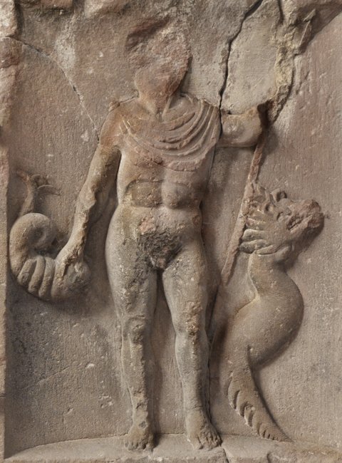 Mythische Figur : im eingetieften Bildfeld stehender nackter Neptun, Mantel um die Schultern, in der erhobenen Linken Dreizack, in der Rechten Fisch. Neben dem linken Bein Seedrache. - Inschrift