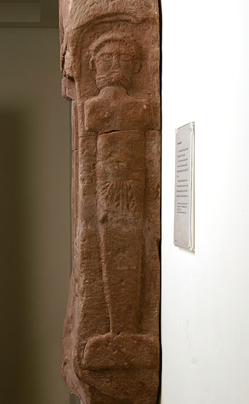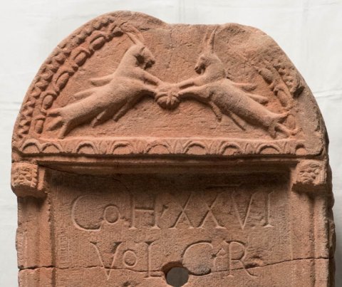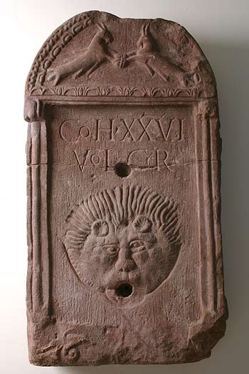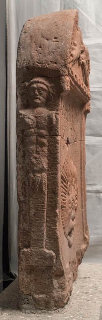 - Rundbogiges Giebelfeld mit Zackenband und Perlstab gerahmt, auf der unteren Rahmenleiste Blattkyma. Im Bogenfeld 2 Capricorne. Schriftfeld mit Eckpilastern, oben Inschrift, darunter Löwenkopf-Wasserspeier. Auf der unteren Rahmenleiste Ranke. Auf den Schmalseiten links eine jugendliche, rechts eine bärtige Herme.