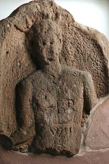 - 2 Fragmente, Mittelteil und Unterteil fehlen, neuzeitliche Graffitti auf der Brust