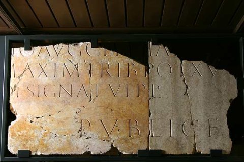 - [Imp(eratori) Caesari divi Nervae] / [f(ilio) Nervae Traian]o Aug(usto) Germa[nico] / [Dacico pontif(ici)] maxim(o) trib(unicia) pot(estate) XV / [imp(eratori) VI co(n)s(uli) V] designat(o) VI p(atri) p(atriae) / [Equestr(es?)] publice
