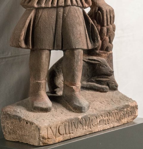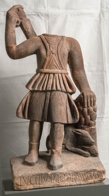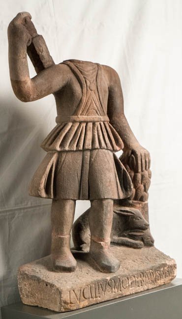- Mythische Figur : auf eckiger Basis stehende Diana-Abnoba in kurzem Gewand, die Rechte greift zum Köcher, die Linke liegt auf einem Altar (?) mit Früchten. Neben dem linken Bein Hund und Hase. Votivinschrift auf der Ober- und Vorderseite des Sockels.