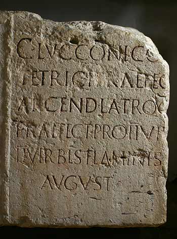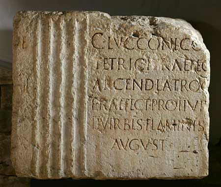 - C(ai) Lucconi Co[rn(elia)] / Tetrici praefec[ti] / arcend(orum) latroc[in(iorum)] / praefect(i) pro II vir[o] / II vir(i) bis flaminis / August(i)