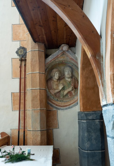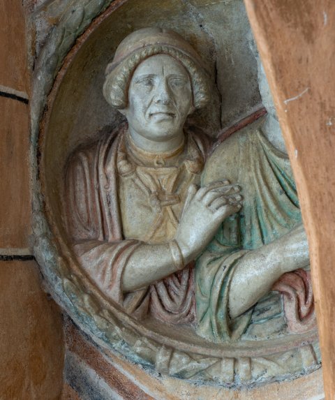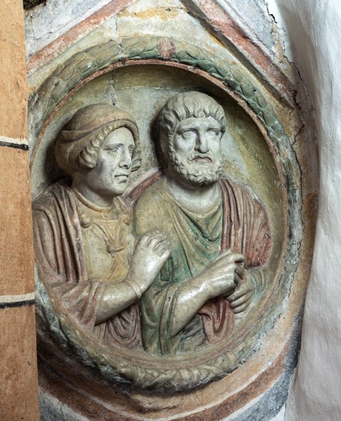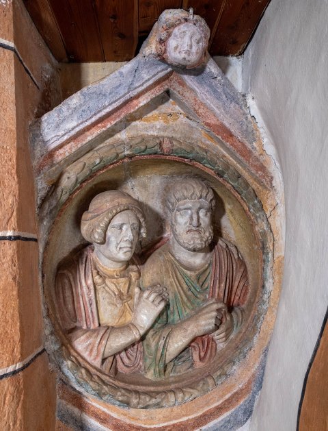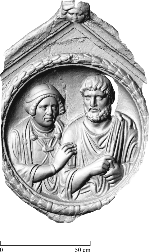 - In Lorbeerkranzrahmen mit Tänien zwei Halbfiguren (Ehepaar). Links einheimische Frau: Haube, Umhang, Doppelknopffibeln, auf der Brust Fibel, Halsreif mit Lunula, Armreif. Rechts Mann: bärtig, hadrianische Frisur, Tunica, Toga, in der Linken Rolle (volumen), Fingerring. Über dem Medaillon Giebel mit Gorgoneion.