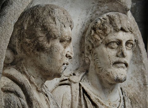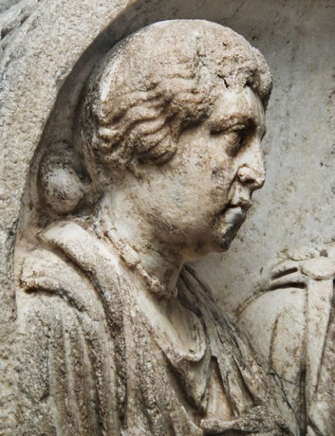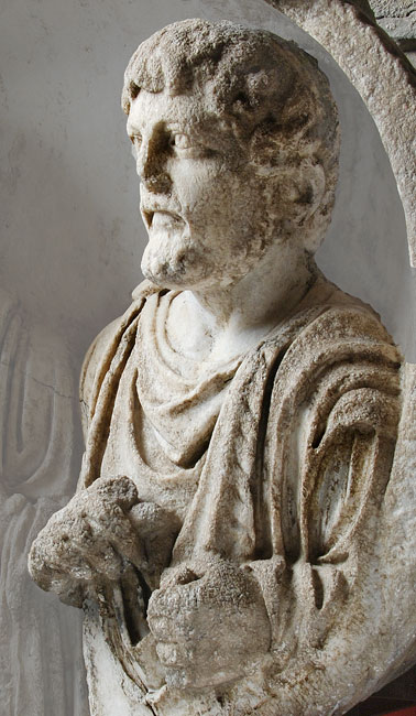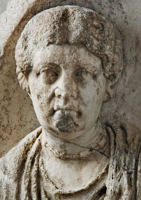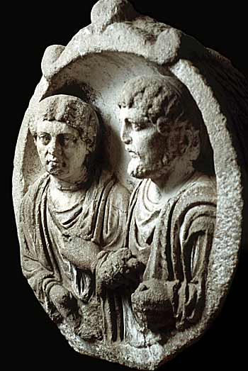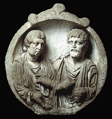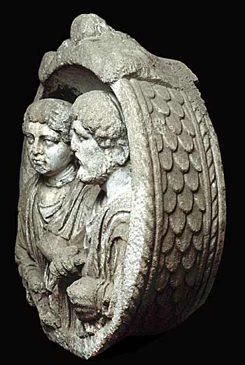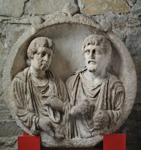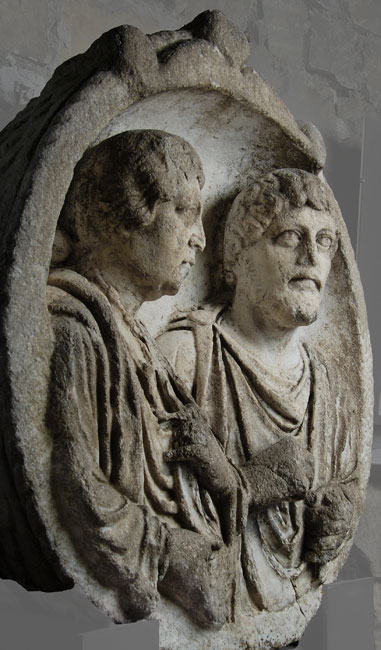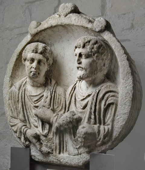 - Medaillon, auf der Außenseite des Rahmens Lorbeerkranz zwischen tordierten Bändern, vorn glatter Rahmen, oben drei Voluten (Muschel ?). Zwei Halbfiguren (Ehepaar). Links Frau: Frisur der Faustina Minor, Mantel, Halskette, Armreifen, in der Rechten Apfel. Rechts Mann: bärtig, Locken, Ärmeltunica, Sagum mit Fransen, Scheibenfibel, in der Linken Rolle (volumen).