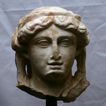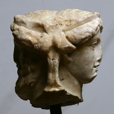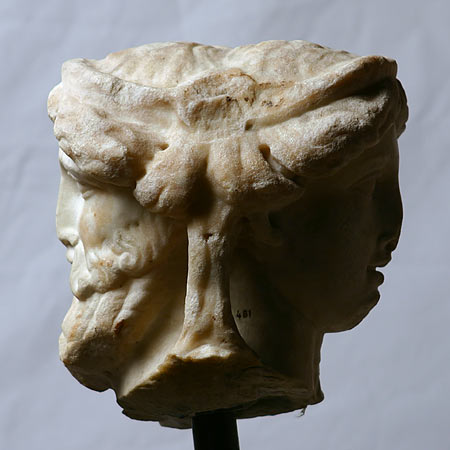 - Mythische Figur (Bacchus, Ariadne) : archaisierender bärtiger Kopf und weiblicher Kopf im klassischen Stil, beide mit glattem Diadem und langen Schulterlocken.