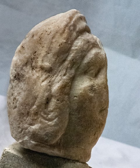 - Kopf einer Frau, auf dem Scheitel ein Diadem, langes in der Mitte gescheiteltes Haar. Schleier ?