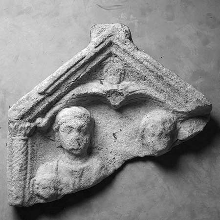 - Familie : Giebel auf Säulen, dazwischen Muschelnische. Brustbilder eines Ehepaares, davor Kinderkopf (Knabe mit Horuslocke).