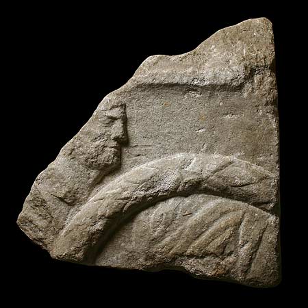 - Mythische Figur : Medaillon mit Kranzrahmen, darin Rest einer bekleideten Büste (Jahreszeit ?), im Zwickel Büste eines Windgottes. Teil einer Aedicula-Decke ?