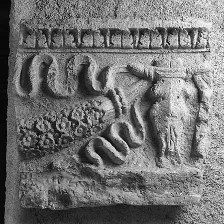 - An Bukranien aufgehängte Blütengirlande mit Tänien, oben von Blattkyma gerahmt.