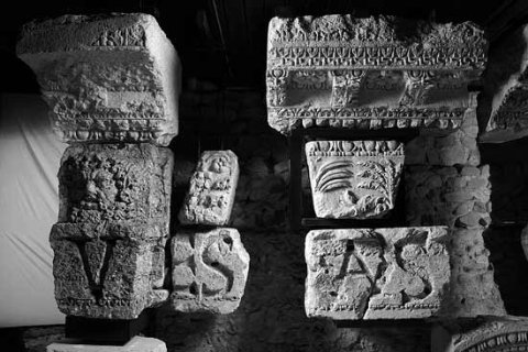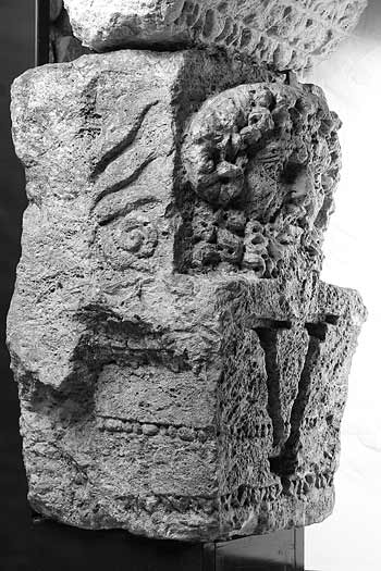 - Zum 1. Stock der Außenfassade der 2. Forumsbasilika gehörendes Gebälk. Unten durch Blatt- und Eierstab gegliederte Architravzone, die über den Säulen vorspringt. Auf der Vorderseite Eintiefungen für monumentale Bronzebuchstaben (V, E S, A S). Darüber Frieszone mit Palmetten-Akanthusranken und bärtigem Jupiter-Ammon-Kopf mit Widderhörnern auf dem Gebälkvorsprung. Auf der linken Nebenseite aus Volutenranken wachsende Pflanze.